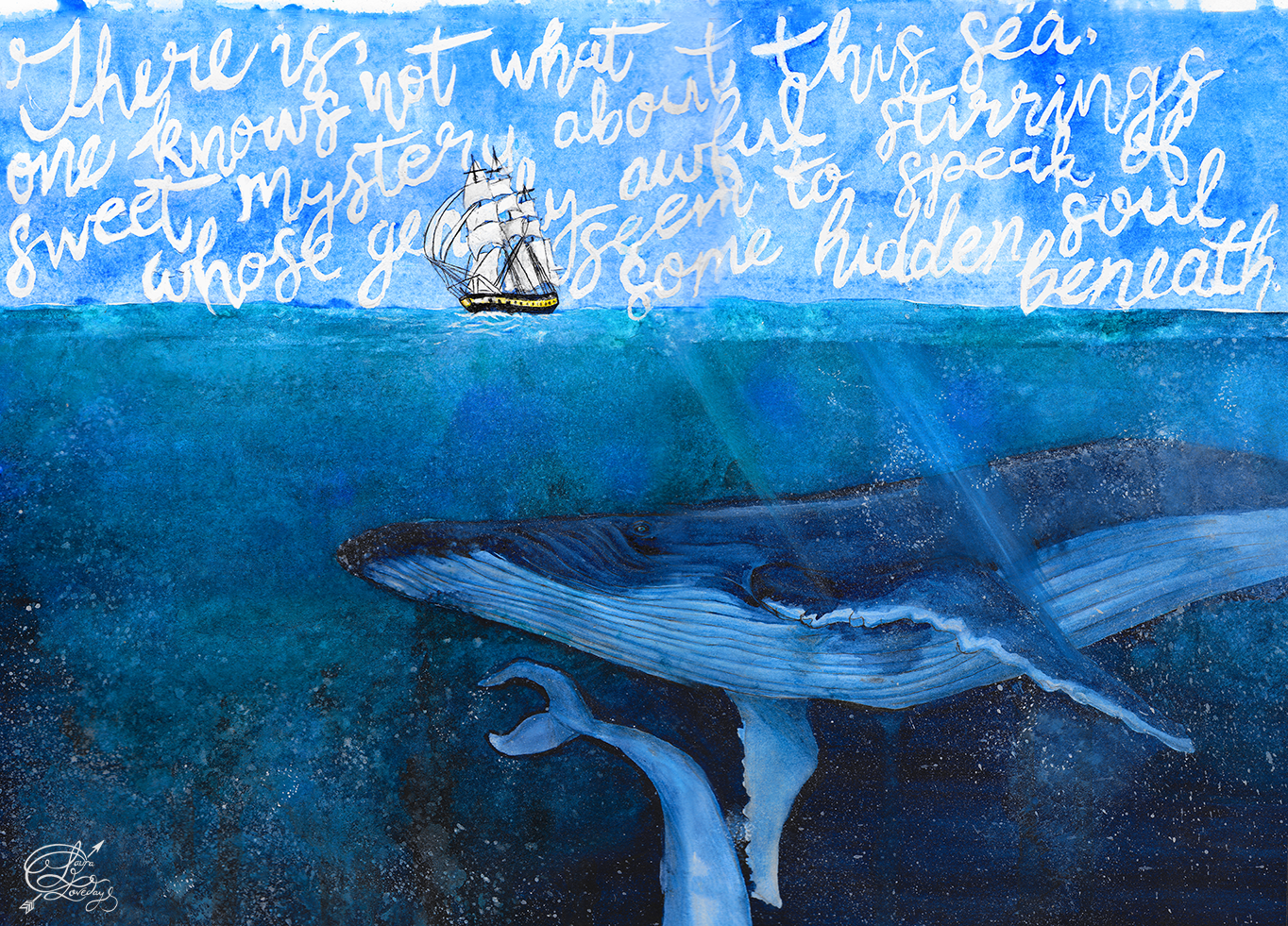 Inspired by a Herman Melville quote from Moby Dick, only using blue whales to show the sea as being a kingdom with creatures which dwarf the world on land. Textured watercolour on cold-pressed paper.